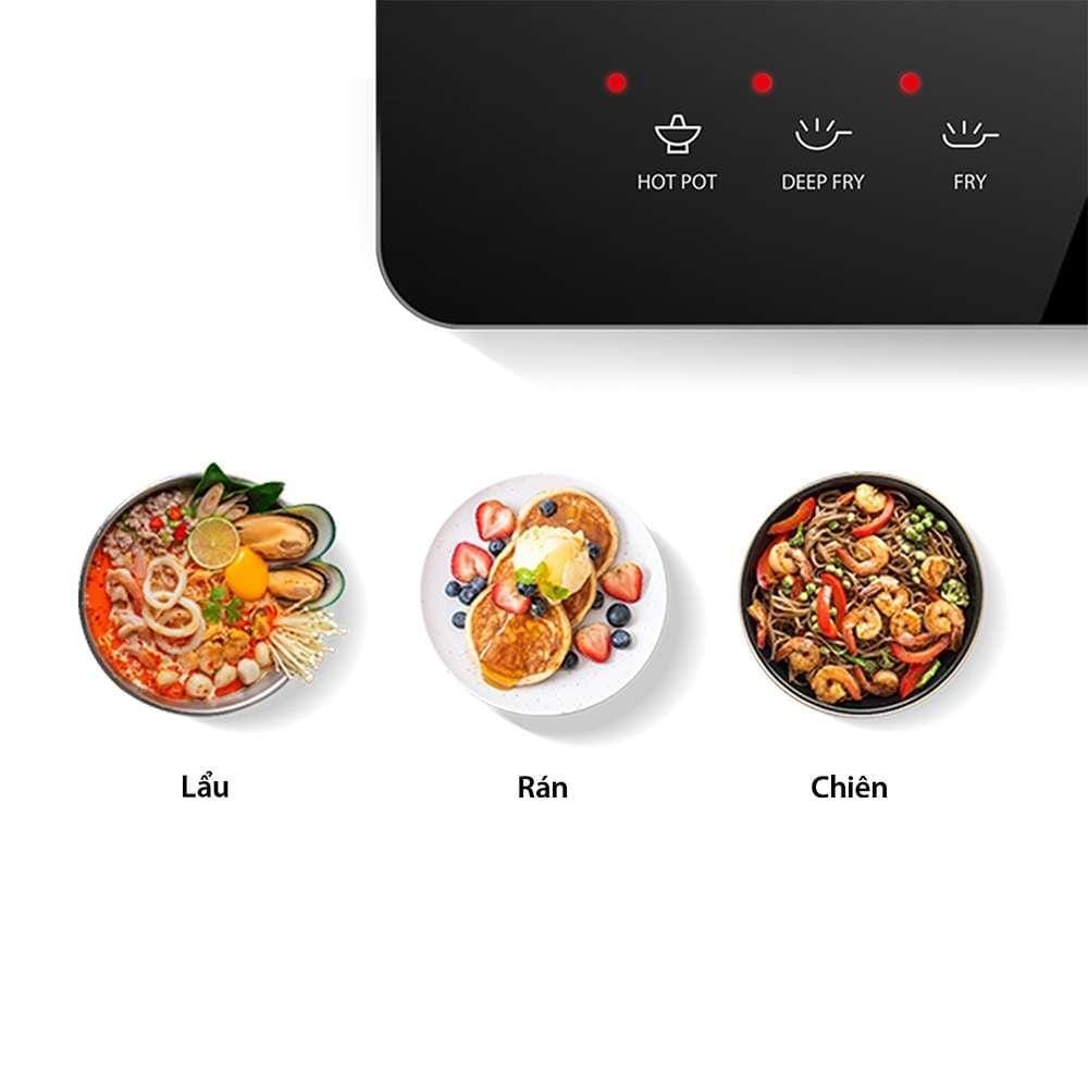 Mâm từ được thiết kế bởi 2 cuộn dây lớn, đặt song song giúp gia tăng hiệu suất gia nhiệt lên gấp đôi, nhiệt lượng mạnh mẽ do từ trường tạo ra làm thức ăn chín đều nhanh chóng. Linh hoạt nấu nướng với tùy chọn nhiều mức công suất từ 120W đến 2000W chỉ với 2 nút bấm đơn giản “+” và “-“ : 120W/300W/800W/1000W/ 1300W/1600W/1800W/2000W. Với 3 thực đơn phổ biến (Nấu lẩu, chiên và chiên ngập dầu), bạn có thể dễ dàng chọn lựa chương trình phù hợp chỉ với 1 nút nhấn. Bất kể là bữa ăn hàng ngày, hay tổ chức tiệc tùng, chiếc bếp sẽ đủ công năng để tùy biến nhiều món, bao gồm Nấu Súp, Cháo, Lẩu, Chiên xào…