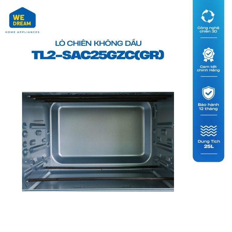 TL2-SAC25GZC với công nghệ chiên 3D, giúp tản nhiệt xuyên thấu. Đảm bảo thực phẩm chín vàng hoàn hảo. Công suất 1500W, 6 thanh nhiệt và quạt đối lưu giúp các món nướng chín đều 2 mặt với vỏ vàng giòn nhân mềm ngọt. Giờ đây món gà nướng nguyên con với lớp da giòn, thịt mềm, vị ngọt đã trở nên nhanh chóng và dễ dàng hơn.