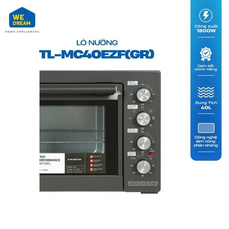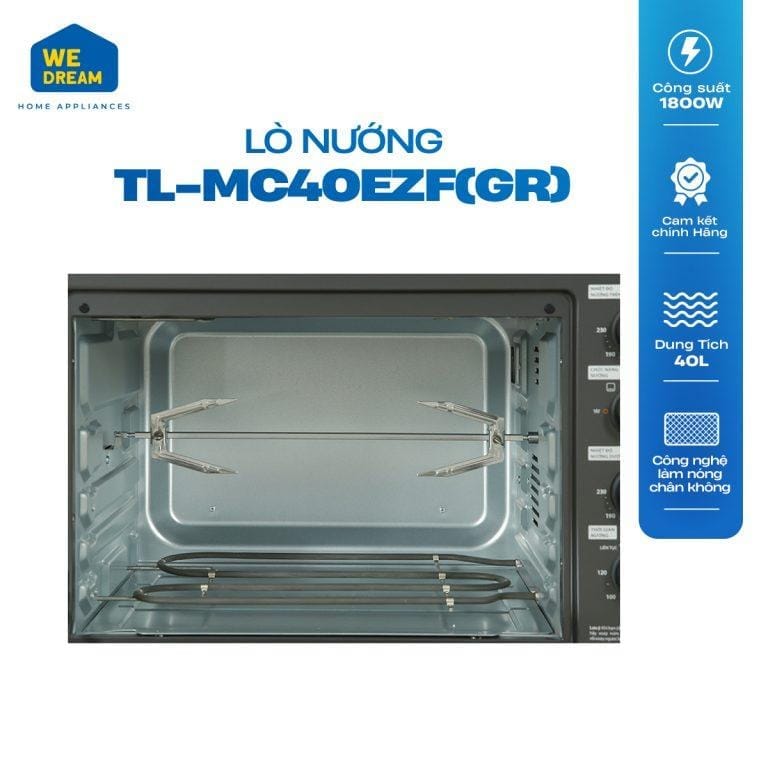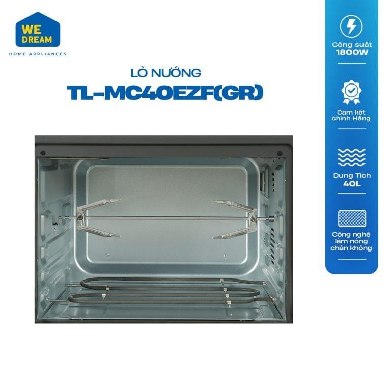 Lò nướng Toshiba TL-MC40EZF(GR) với dàn nhiệt làm nóng tự động. Truyền nhiệt từ trên xuống và thanh nướng xoay 360° nên thực phẩm luôn được làm nóng đồng đều từ mọi góc độ.