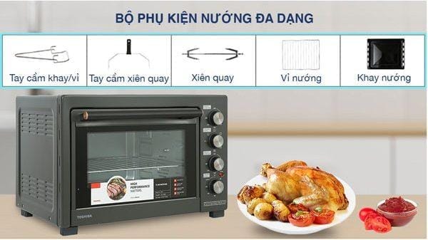 Phụ kiện đi kèm: Khay nướng, Vỉ nưỡng, Khay hứng và các phụ kiện đi kèm khác giúp việc nướng thức ăn tiện lợi, nhanh chóng.