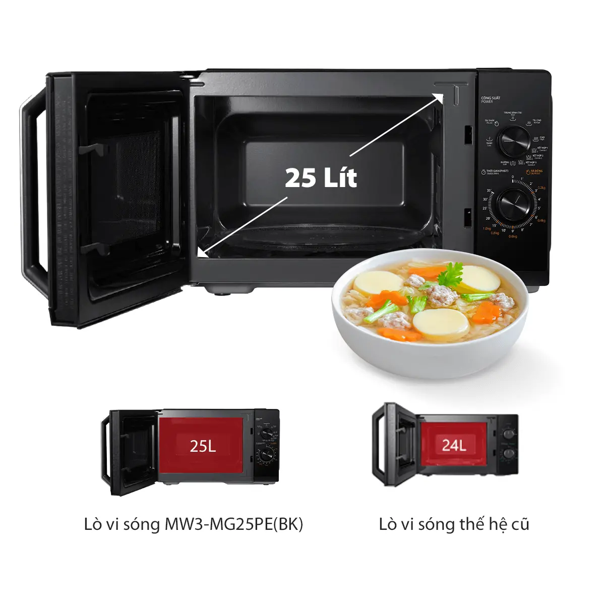 Thiết kế bên ngoài được tối ưu hóa so với các phiên bản trước, giúp tổng thể tích lò nhỏ gọn hơn nhưng vẫn giữ dung tích lớn 25L phù hợp đa dạng các loại tô, dĩa với diện tích bàn xoay lên đến 288mm, để vừa bánh Pizza 11 inch.