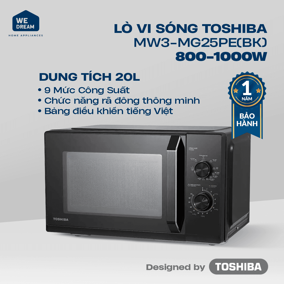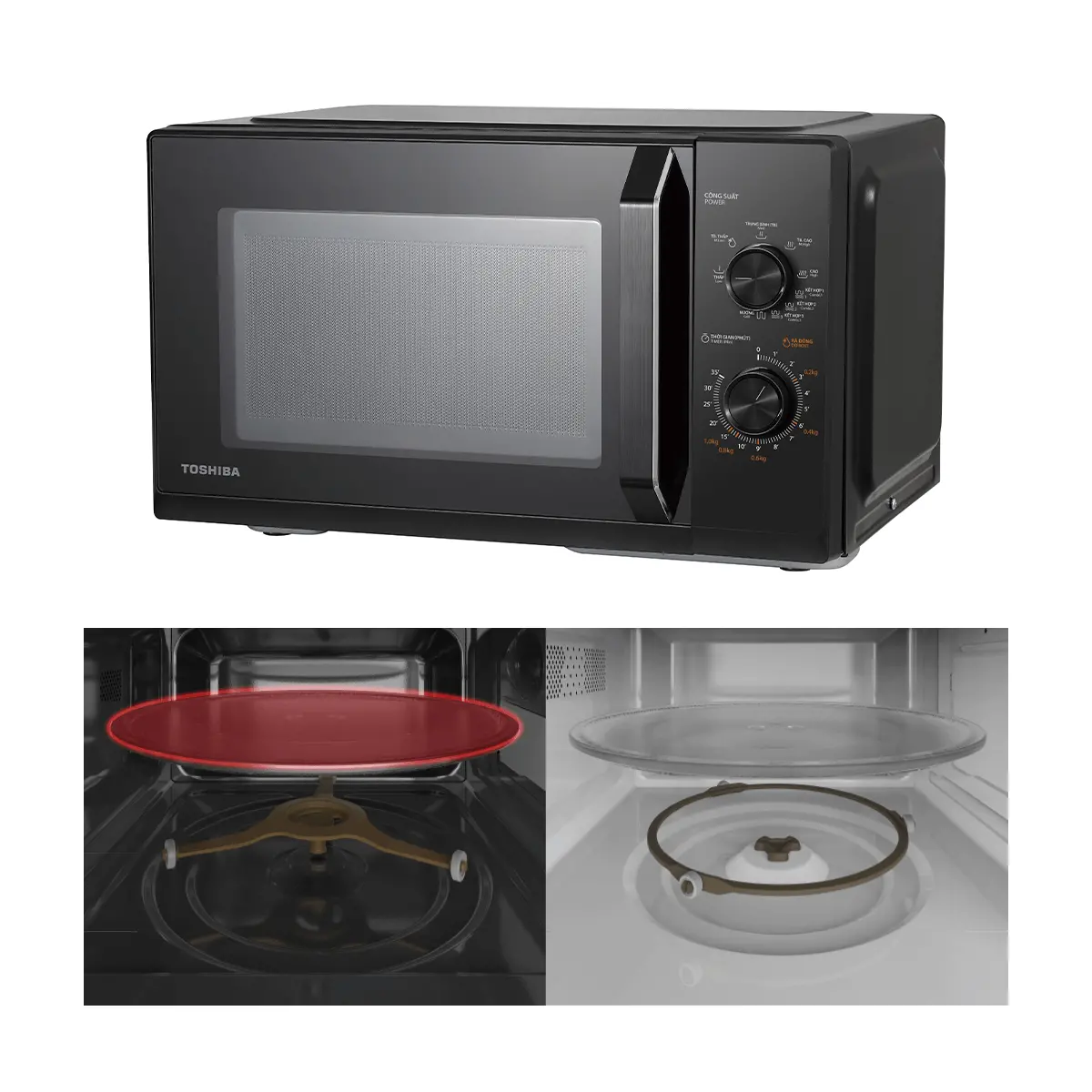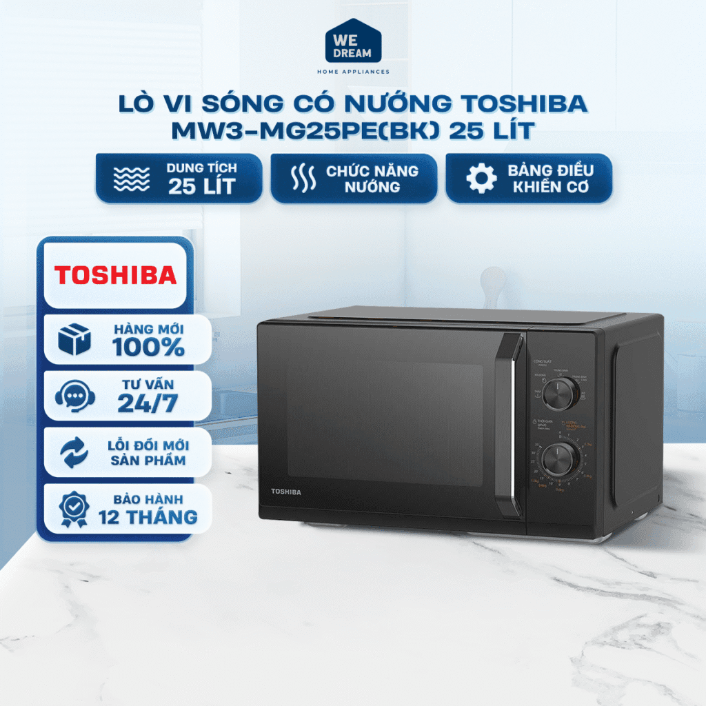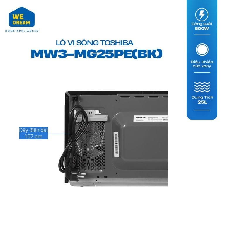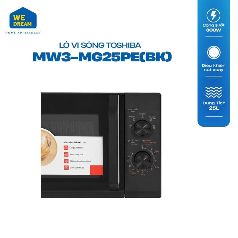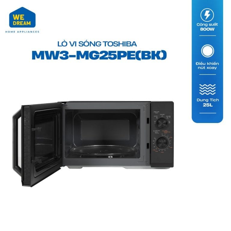 Công suất vi sóng 800W, công suất nướng 1000W cho phép lò vi sóng Toshiba MW3-MG25PE(BK) chế biến đa dạng các món ăn phù hợp mọi nhu cầu ẩm thực gia đình.