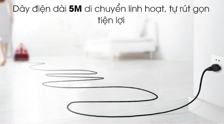 Thiết kế dây điện dài 5m giúp bạn dễ kéo đi xa, máy trang bị cơ chế thu rút dây điện tự động.
