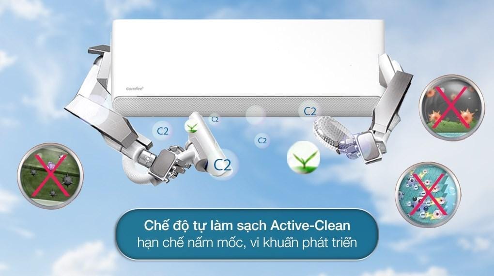 Điều hòa Comfee CFS-13VCB1 trang bị tính năng tự động làm sạch dàn lạnh Active Clean, giữ dàn lạnh luôn khô thoáng, sạch sẽ để thổi ra luồng khí mát mẻ, thanh sạch. Cụ thể, công nghệ này sử dụng chính hơi nước tại dàn lạnh để đóng băng các loại nấm mốc, dầu mỡ, bụi bặm bám trên dàn tản nhiệt. Sau đó đột ngột tăng nhiệt độ để làm tan băng, cuốn trôi các chất bẩn theo dòng nước tan, rồi thực hiện sấy khô để dàn lạnh sạch sẽ trở lại như lúc ban đầu.