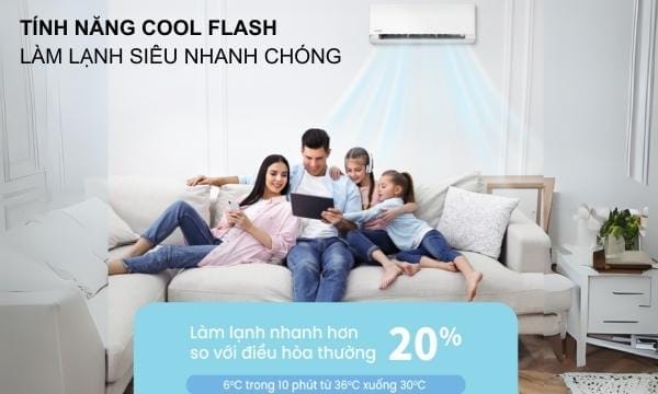 CFS-13VCB1 trang bị công nghệ làm lạnh nhanh Cool Flash cho khả năng khởi động và tăng tốc máy nén ở tốc độ cao, có thể đạt tần số 65Hz trong vòng 6s. Nhờ đó, máy làm lạnh nhanh hơn 20% so với điều hòa thông thường, giảm nhanh đến 6°C trong vòng 10 phút (vd từ 36°C xuống còn 30°C), để bạn nhanh chóng cảm nhận sự mát mẻ.