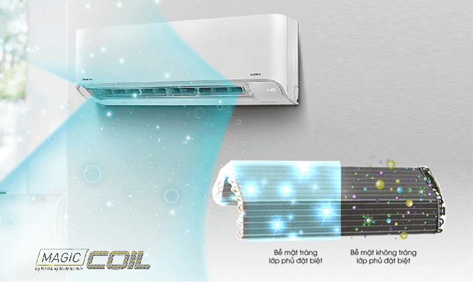Máy lạnh Toshiba Inverter 2 HP RAS-H18E2KCVG-V trang bị Công nghệ Magic Coil giúp ngăn chặn, không cho bụi bẩn bám trên bề mặt ngoài của lá nhôm, hạn chế sự phát triển của nấm mốc, vi khuẩn, từ đó tạo ra những luồng không khí trong lành, bảo vệ sức khỏe cho cả gia đình