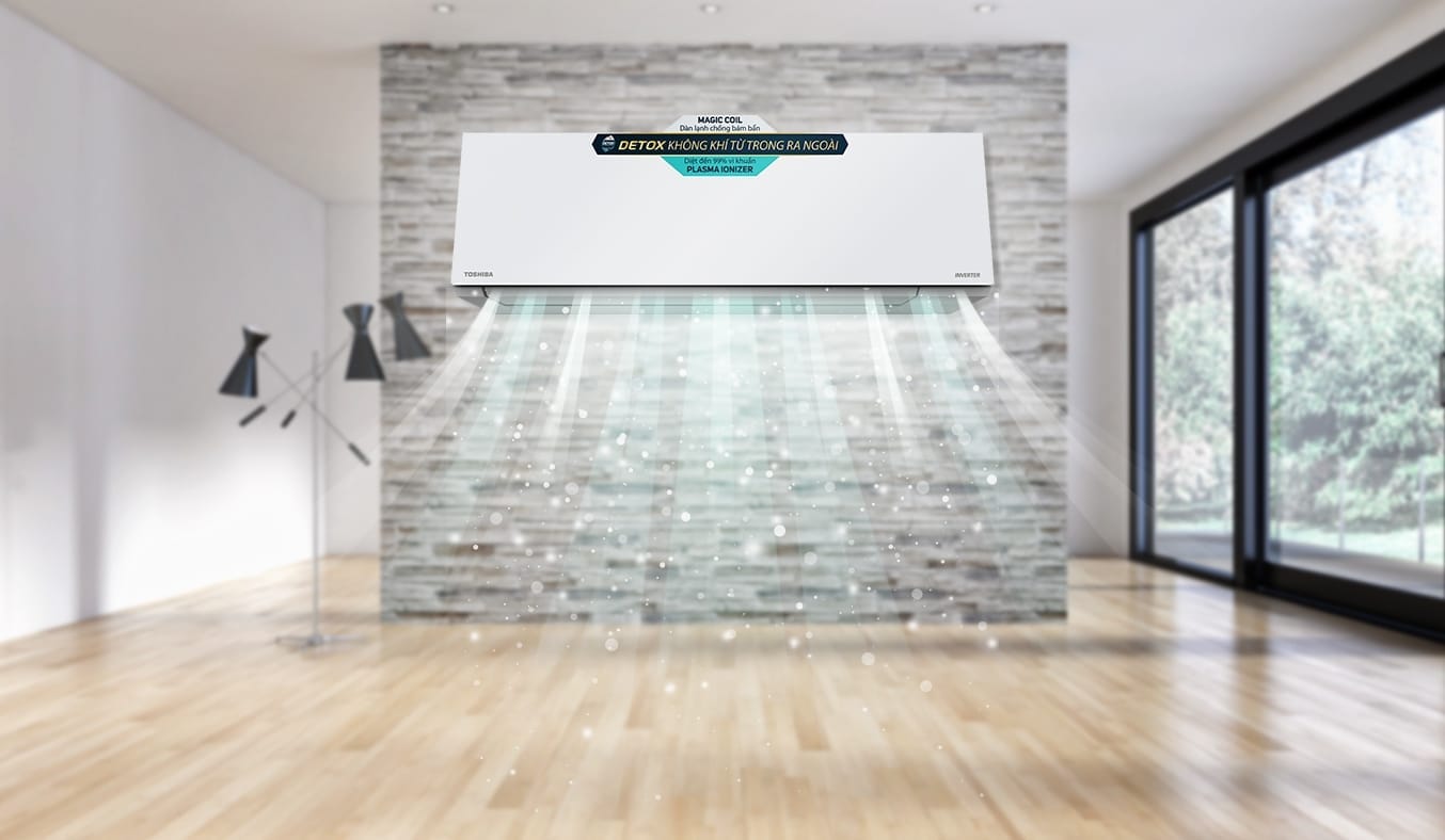 Công nghệ Plasma Ion được trang bị trên Máy lạnh Toshiba Inverter liên tục tạo ra vô số ion tỏa khắp phòng giúp diệt khuẩn mạnh mẽ, khử mùi hiệu quả và lọc siêu bụi PM2.5 mang đến cho bạn bầu không khí trong lành, sạch sẽ.