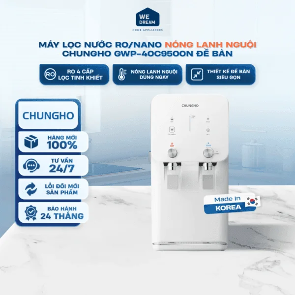 Với sự kết hợp giữa thiết kế nhỏ gọn, khả năng lọc hiệu quả và tiện ích nước nóng lạnh đa dạng, máy lọc nước để bàn ChungHo 450 GWP-40C9500N là lựa chọn phù hợp cho gia đình hiện đại và môi trường làm việc cần nguồn nước sạch, tiện lợi.