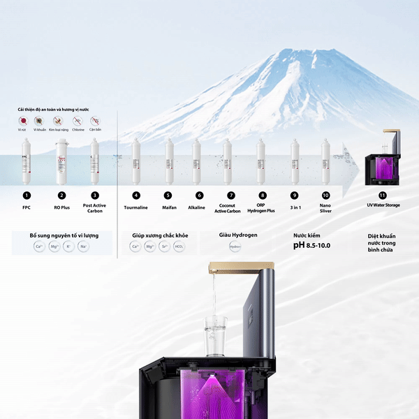 – Lõi chức năng​: lõi Tourmaline, Maifan, Alkaline, Coconut Active Cacbon, ORP Hydrogen, Đá khoáng 3in1, Nano Silver.