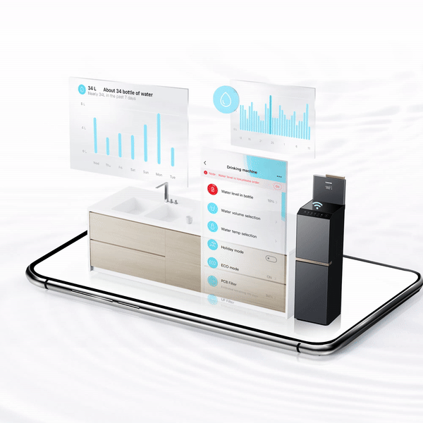 Báo cáo lưu lượng nước sử dụng. Điều khiển chế độ Eco. Cảnh báo lỗi kỹ thuật. Thông tin lõi lọc. Quản lý tuổi thọ lõi lọc. Kết nối trung tâm bảo hành
