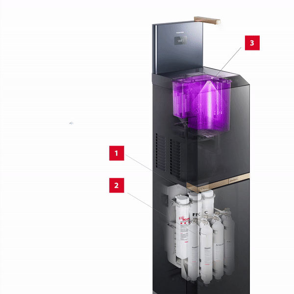 Máy lọc nước Toshiba OriginPure™ áp dụng thiết kế khác biệt hoàn toàn với cấu trúc tích hợp New-Gen, đặt bình chứa nước gần cửa xả nước hơn, kết hợp với đèn diệt khuẩn UV, đảm bảo nước được lưu trữ trong môi trường an toàn lâu dài, không bị nhiễm độc hay tái sinh vi khuẩn.