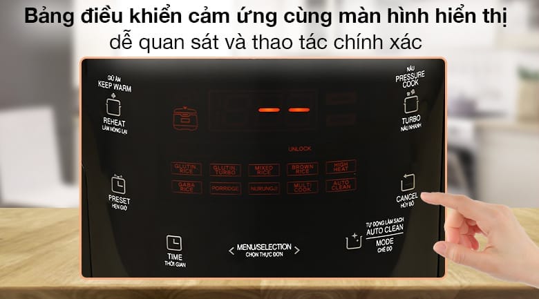 Bảng điều khiển gồm 12 chương trình cài đặt sẵn, trong đó có 9 chế độ nấu, 1 chế độ vệ sinh tự động, giữ ấm và hâm nóng.