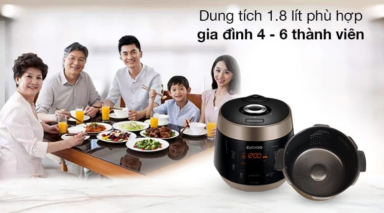 Dung tích 1,8 lít, phù hợp cho gia đình 4-6 thành viên, nấu được 8 -10 cốc gạo kèm nồi.