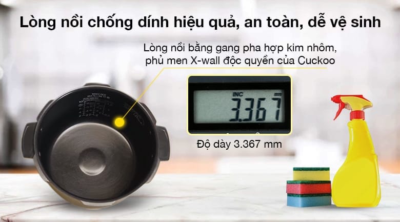 Lòng nồi dày phủ men X-wall độc quyền của Cuckoo, chống dính tốt, an toàn cho sức khoẻ, dễ vệ sinh.