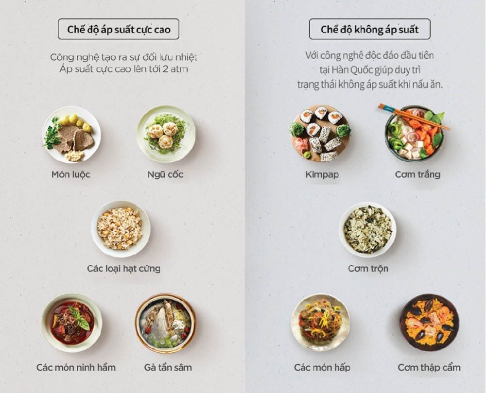 Tính năng này cho phép người dùng có thể lựa chọn chế biến món ăn với áp suất cao hoặc nấu không áp suất (Nấu thường).