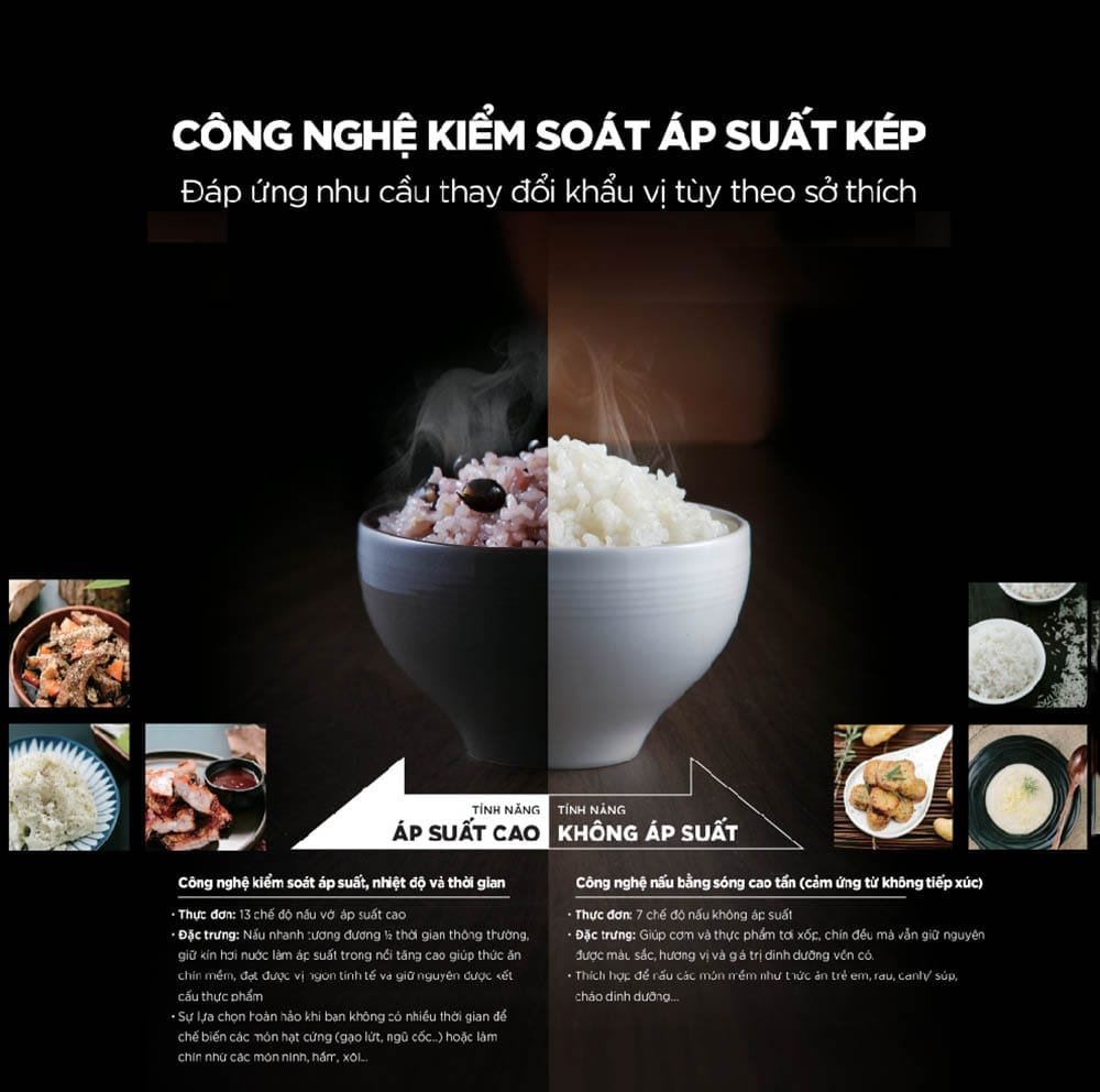 Chức năng nấu với áp suất cao lên đến 2.0 ATM (Gồm 13 chế độ nấu): Áp dụng công nghệ kiểm soát áp suất, nhiệt độ, thời gian. Nồi cơm điện giữ kín hơi nước làm cho áp suất trong nồi tăng cao giúp thức ăn chín mềm, thơm ngon, đảm bảo giữ nguyên kết cấu của thực phẩm. Chế độ này thích hợp dùng để nấu các món hạt cứng (Gạo lứt, ngũ cốc) hoặc làm chín nhừ các món ninh, hầm…
