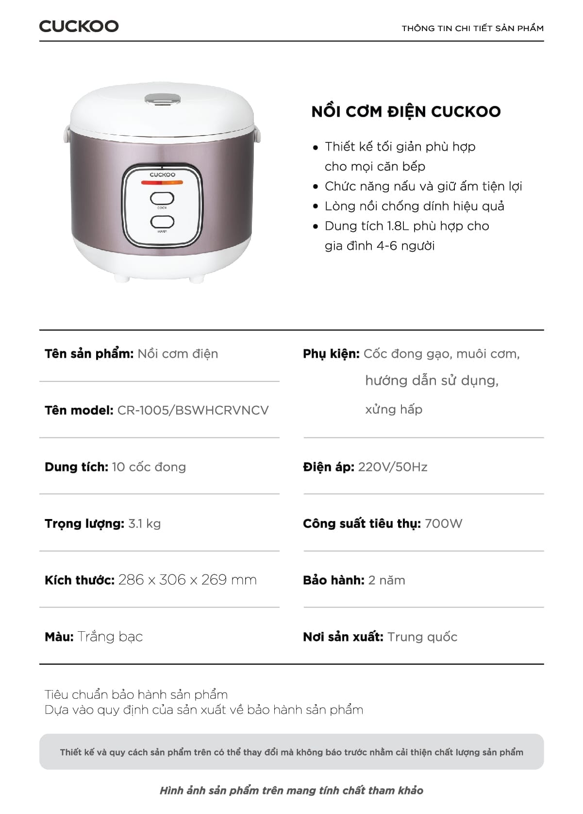 Nồi Cơm Cơ Cuckoo 1.8 Lít CR-1005/BSWHCRVNCV Nồi Cơm Cơ Cuckoo 1.8 Lít CR-1005/BSWHCRVNCV