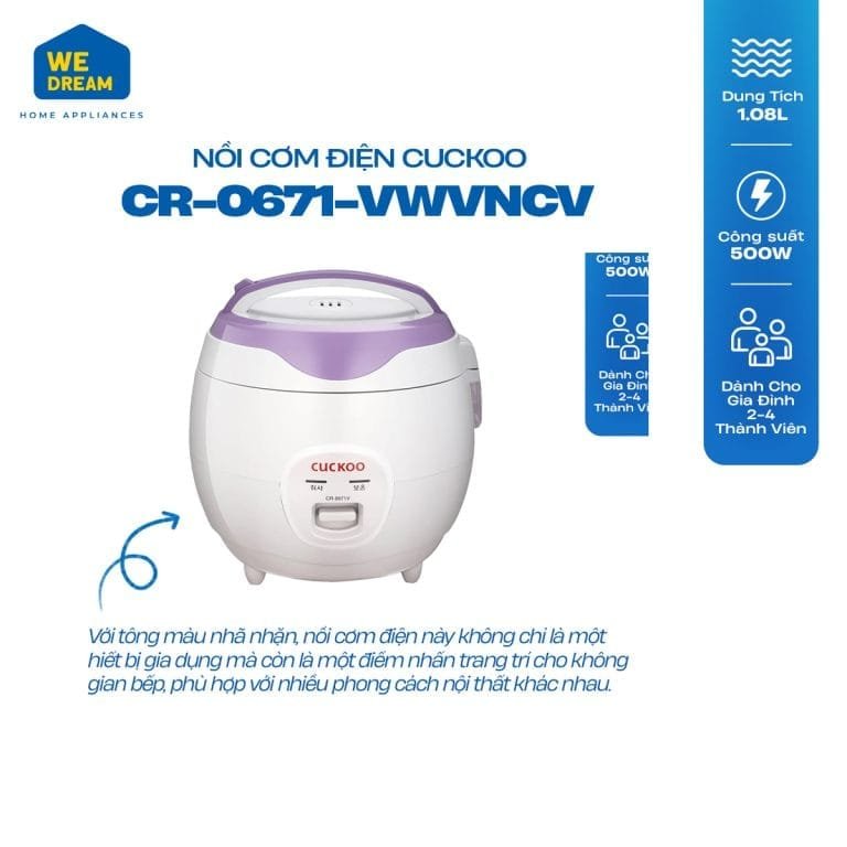 Với thiết kế gọn nhẹ và các tính năng tiên tiến Nồi cơm điện Cuckoo CR-0671V hứa hẹn mang đến giải pháp nấu ăn tiện lợi, chất lượng cao cho những bữa cơm gia đình ấm cúng.