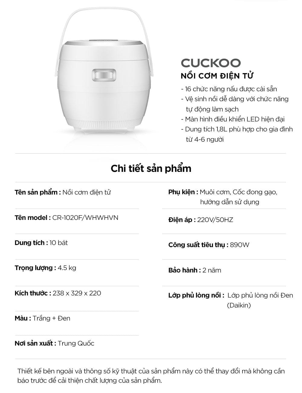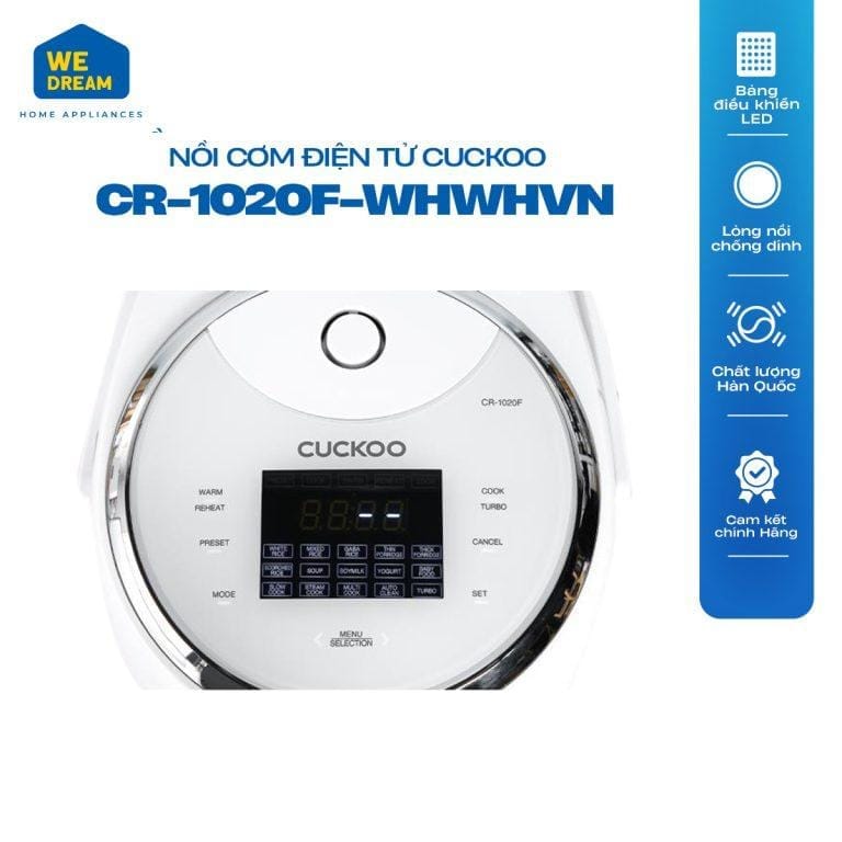 Nồi Cơm Điện Tử Cuckoo 1.8 Lít CR-1020F - Bảng Điều Khiển Led, Lồng Nồi Chống Dính