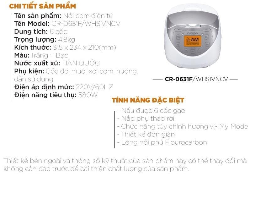 Nồi Cơm Điện Tử Cuckoo CR-0631F/WHSIVNCV 1 Lít